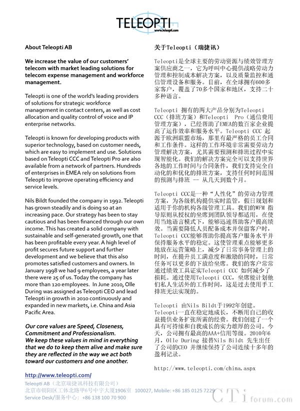 Teleopti是全球主要的方案供應(yīng)商之一,它為呼叫中心提供戰(zhàn)略勞動(dòng)力管理以及控制成本解決方案,以及質(zhì)量監(jiān)控和通信管理設(shè)備和服務(wù)。