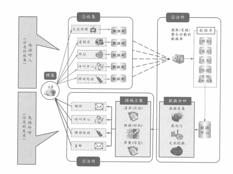 通過(guò)電話呼入收集的信息被儲(chǔ)存在數(shù)據(jù)庫(kù)中。對(duì)儲(chǔ)存的信息進(jìn)行分析,做出營(yíng)銷策劃,以該策劃為基礎(chǔ)進(jìn)行人才培養(yǎng)和環(huán)境整備,來(lái)實(shí)行電話外呼和管理。用電話外呼刺激顧客,用電話呼入再收集顧客反應(yīng)的數(shù)據(jù),根據(jù)分析,活用此數(shù)據(jù)來(lái)實(shí)施更高精密度的電話外呼。