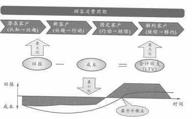 LTV簡(jiǎn)單地說(shuō)就是指在顧客消費(fèi)的全過(guò)程中,企業(yè)所得到的收入與支出的差額。而LTV的最大化是指,將下圖中回報(bào)部分的面積和成本部分的面積之差,也就是收支合計(jì)的結(jié)果,最大化,并盡量增加從單個(gè)客戶那里所得到的收益。