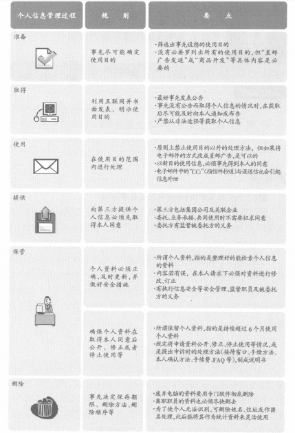 個人信息是在特定使用目的、公告或者通知的基礎上獲得的,要將對其的安全管理和監(jiān)督貫徹到底。申請公布等的咨詢對應和危機管理體制也要加以整備,使之標準化。