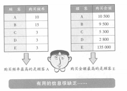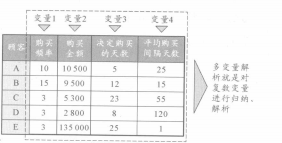既然有多變量解析,當(dāng)然也就有一個(gè)變量或是兩個(gè)變量的解析。我們把變量是一個(gè)的叫做單變量解析或者一變量解析,把變量是兩個(gè)的叫做二變量解析。用一變量解析和二變量解析,可以通過(guò)查頻率分布和散布圖得到一些信息。這些方法非常簡(jiǎn)單,也比較容易理解,但另一方面因?yàn)樽兞刻?,只能看到?shí)物的一個(gè)或兩個(gè)方面,得出的結(jié)果,一般沒(méi)有什么意義。例如上文所列舉的顧客數(shù)據(jù),如果一個(gè)一個(gè)變量地看,購(gòu)買頻率最高的是A.購(gòu)買金額最高的是E。只能得到這樣的數(shù)據(jù)。