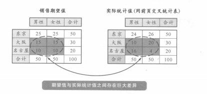 在大阪和名古屋,通過(guò)同樣的計(jì)算,發(fā)現(xiàn)期望值和實(shí)際統(tǒng)計(jì)值有很大的差異。名古屋女性這一欄尤為顯著,期望值是10人,而實(shí)際統(tǒng)計(jì)值只有4人,這樣我們就知道期望值是實(shí)際值的2.5倍。像這樣有很大差異的項(xiàng)目?jī)?nèi)容,在評(píng)價(jià)和解釋交叉統(tǒng)計(jì)表的時(shí)候就非常引人注目。負(fù)責(zé)分析的人員將把產(chǎn)生這種差異的原因也包括在內(nèi),對(duì)統(tǒng)計(jì)結(jié)果進(jìn)伸價(jià)、分析。