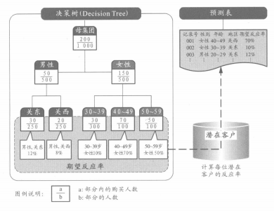 預(yù)測(cè)表是顧客將發(fā)生某種行動(dòng)的概率(期望反應(yīng)率)一覽表。要制作預(yù)測(cè)表,需先使用統(tǒng)計(jì)的分析方法構(gòu)建顧客行動(dòng)模式,以該模式為基礎(chǔ),通過(guò)打分來(lái)算出每個(gè)顧客的期望反應(yīng)率(預(yù)測(cè)值)。較容易理解的例子就是決策樹(shù)"(DecisionTree)。決策樹(shù)是通過(guò)樹(shù)形圖來(lái)表示數(shù)據(jù)項(xiàng)目間的因果關(guān)系,同時(shí)計(jì)算出不同屬性顧客的期望反應(yīng)率。制作顧客行動(dòng)模式時(shí),一般運(yùn)用市場(chǎng)上銷售的數(shù)據(jù)挖掘軟件,如Market Switch公司銷售的TrueforTransactionModeling(TTM)等。