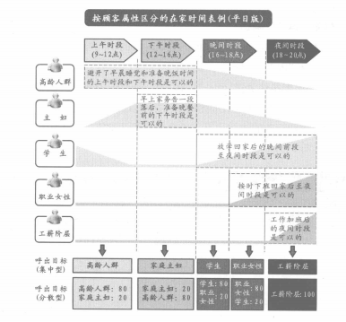 撥打固定電話時(shí),提高接通率的方式是在顧客在家的時(shí)候打電話。但是,要掌握每一個(gè)初次通話的顧客的行動(dòng)模式是不可能的,所以需要了解性別、年齡及工作狀況等顧客屬性,推測(cè)其在家時(shí)間段和忙碌時(shí)間段。