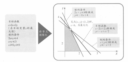 不喜歡公式的人大概對(duì)到此為止的解說敬而遠(yuǎn)之,但其實(shí),簡單的線性規(guī)劃問題早已在高中數(shù)學(xué)中學(xué)過。不知道你對(duì)下頁圖還有印象嗎?