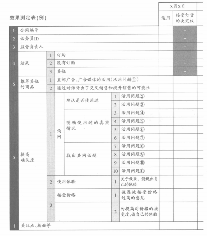 效果測定表是包含在腳本中,為了達到外呼目的,在重要的疑問及話題上,根據(jù)話務(wù)員記錄的實際使用成果的有無,來明確顧客反應(yīng)度,確認(rèn)腳本的有效性一種途徑。以下的效果測定表已在第六章中使用過。