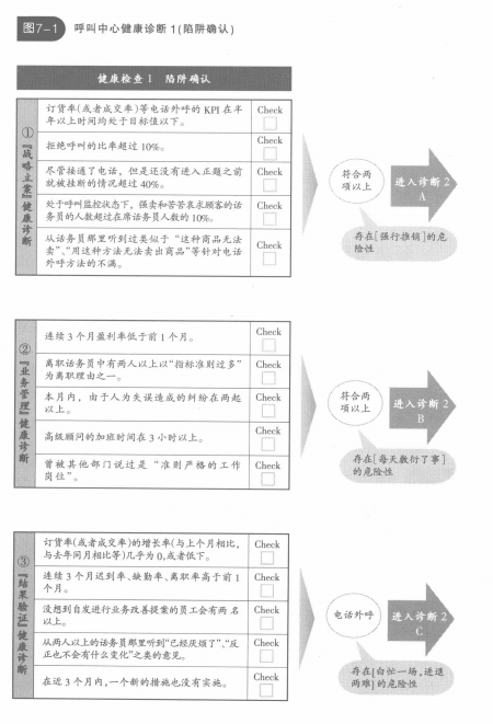 不管何種情況,把握現(xiàn)狀、發(fā)現(xiàn)問(wèn)題、執(zhí)行解決策略的立案、結(jié)果驗(yàn)證都是迅速解決問(wèn)題的重點(diǎn)。最簡(jiǎn)單的方法就是,利用"呼叫中心的健康檢查",把握呼叫中心的健康狀況,然后依據(jù)"3大陷阱和12種處方",將改進(jìn)落實(shí)。