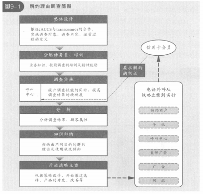 這次項目的目的不但是充分利用JACCS的呼叫中心這個已有的途徑,收集、分析打算解約的顧客的真實想法,減少信用卡的解約數(shù),還要挖掘新客戶,提高滿意度(見圖9-1)。