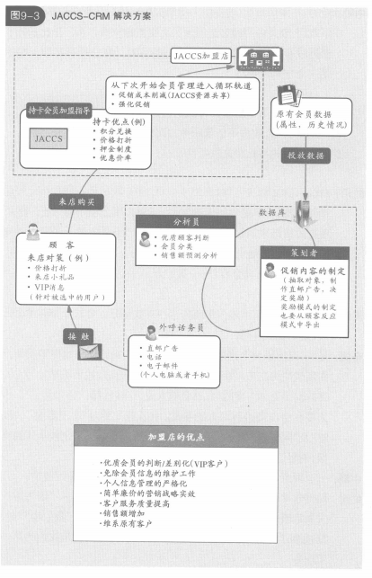 虻川:JACCS-CRM解決方案(見圖9-3),就是事先從各個合作商那里得到數(shù)據(jù),不僅是信用卡的使用,還包含現(xiàn)金使用的分析。然后根據(jù)分析結(jié)果,著手電話外呼的提案。不是依賴于經(jīng)驗或者感覺從企業(yè)出發(fā)進行分析,而是從客戶的立場來分析數(shù)據(jù),這樣才能提高顧客的滿意度——我們是基于這個想法而開始做這個項目的。