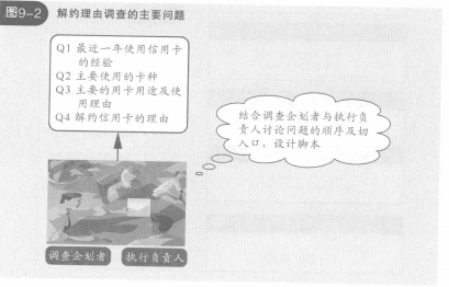 因此在調(diào)查當(dāng)中,必須設(shè)定可以準(zhǔn)確地詢問出決定信用卡使用或者解約的因素,對顧客的真實意見進行菜度分析。項目成員在考慮調(diào)查手段及呼叫中心實際調(diào)查時的各種制約條件的同時,進行慎重的調(diào)查設(shè)計(見圖9-2)。比如,為了不給顧客造成心理1的負擔(dān),不會貿(mào)然詢問為什么解約,而是逐漸建立與顧客的信賴關(guān)系,分階段詢問顧客信用卡使用的實際情況,在問題的順序和表達技巧上下工夫。