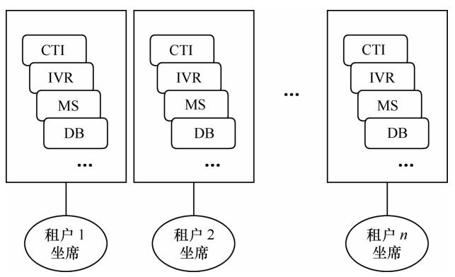 每個(gè)租戶獨(dú)占一套CTI、IVR等組件,不與其他租戶共享該CTI、IVR等組件。租戶的坐席登錄到相對(duì)應(yīng)的CTI上,各個(gè)租戶所屬的組件之間相互獨(dú)立。各個(gè)組件可以部署于虛擬機(jī)和資源池上,以實(shí)現(xiàn)快速部署。