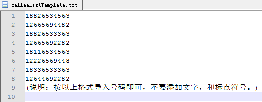 上傳呼叫名單時,與黑名單號碼一樣,具有去掉重復(fù)號碼的功能,也就是說說導(dǎo)入每一個號碼的時候會檢驗系統(tǒng)中是否已經(jīng)存在此號碼,如果不存在方可繼續(xù)導(dǎo)入。導(dǎo)入呼叫名單時號碼不可超過 10W 個,否則因系統(tǒng)上傳壓力過大導(dǎo)致上傳號碼失敗。呼叫名單同樣提供了 txt、Excel 格式的導(dǎo)入模板,點擊兩個模板即可下載,模板效果圖例如下圖所示。