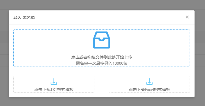 從文件導(dǎo)入黑名單:該操作從文件中導(dǎo)入黑名單號碼。點擊導(dǎo)入按鈕,彈出如下圖所示數(shù)據(jù)配置框,選擇黑名單號碼文件,將黑名單文件拖拽至上方藍色虛線框內(nèi)或者點擊導(dǎo)入文件。