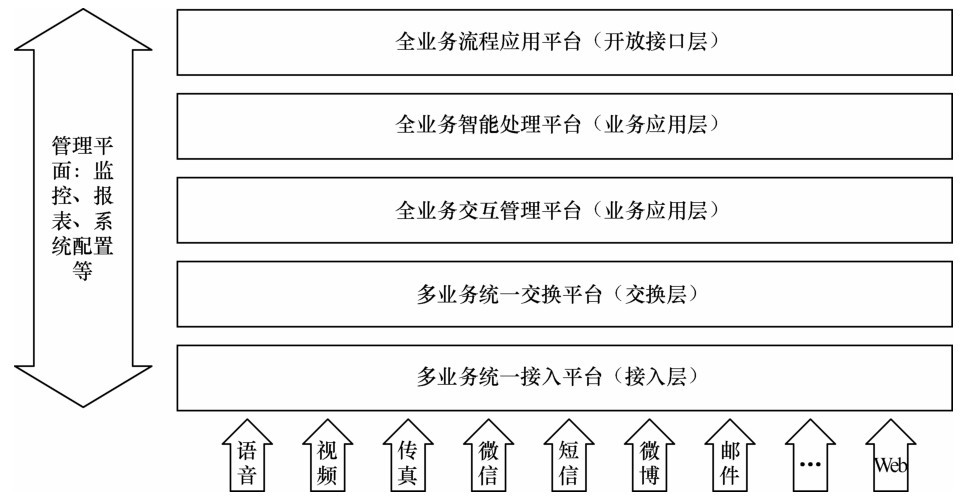 按照統(tǒng)一通信的原理和構(gòu)架,可以將呼叫中心構(gòu)架進一步完善,其分層將更加扁平化,呼叫中心的構(gòu)架可分為全業(yè)務接入平臺、全業(yè)務交換平臺、全業(yè)務交互管理平臺、全業(yè)務智能處理平臺、全業(yè)務流程接口平臺5層。其中,全業(yè)務接入與交換平臺負責處理各種通信媒體的接入,包括郵件、短信、微信、微博、電話、視頻等,可兼容原有的;全業(yè)務交互管理平臺可以完成各類通信的交互,包括傳統(tǒng)的呼叫交互和新增的消息交互;全業(yè)務智能處理平臺對消息和呼叫進行智能管理,它又包括交互式應答系統(tǒng)、智能機器人系統(tǒng)、智能路由系統(tǒng)等;全業(yè)務流程處理平臺可以統(tǒng)一處理各類業(yè)務流程,不再區(qū)分郵件、短信、微信、微博、電話、視頻等業(yè)務。扁平化的呼叫中心構(gòu)架在NGCC實現(xiàn)VoIP通信能力的基礎上,又實現(xiàn)了即時消息業(yè)務能力、對業(yè)務的統(tǒng)一管理能力和開放的全業(yè)務接口,符合統(tǒng)一通信的原理和趨勢。