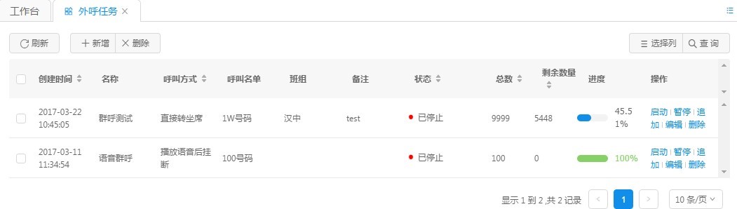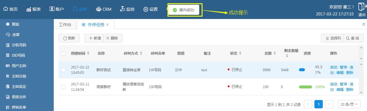 啟動:啟動是對外呼任務(wù)的一種控制方式,點擊啟動按鈕即可開啟新建的任務(wù)或者中途被暫停的任務(wù),點擊之后頁面頂端會彈出如下的提示表示操作成功。