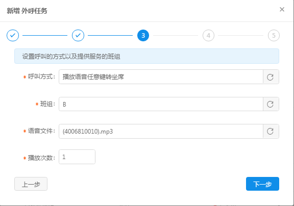③指定群呼方式以及接聽電話的坐席班組,有語音請指定語音文件,點擊下一步;