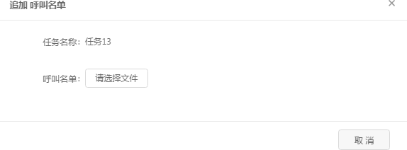 追加:追加操作可以為任務(wù)追加一批新的呼叫名單,任務(wù)可以是新建的、未完成、已完成的。通常在重新建任務(wù)比較麻煩的情況下可以采用追加這種方式來完成。 點擊追加按鈕, 彈出如下圖所示的數(shù)據(jù)配置框,直接上傳新的呼叫名單即可。