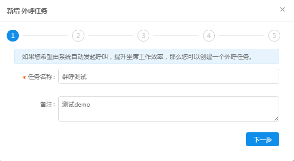 ①配置外呼任務(wù)名稱,注明備注表明任務(wù)目的或者其他等,如下圖所示,點擊下一步;