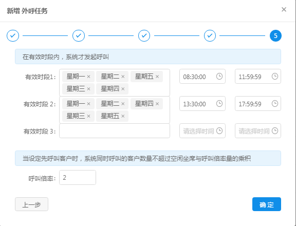 ⑤指定外呼任務(wù)的有效時間段及其呼叫倍率,點擊確定任務(wù)創(chuàng)建完成如下圖。