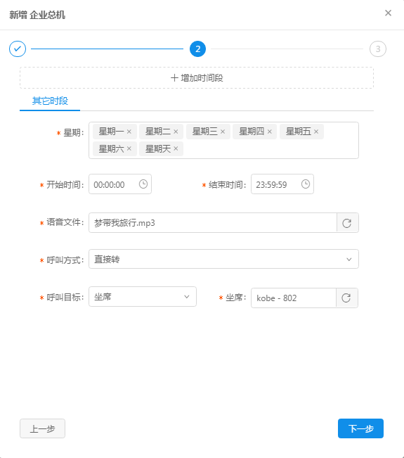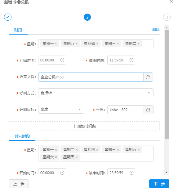 ③如果只設(shè)置默認(rèn)時(shí)間段的總機(jī)行為,請(qǐng)忽略此步驟,跳往步驟④;我們可以做一些個(gè)性化的設(shè)置,不同的時(shí)間段設(shè)置不同的語音導(dǎo)航與總機(jī)行為。點(diǎn)擊增加時(shí)間段按鈕,如下圖所示,可以新增個(gè)性化的總機(jī)行為配置。以此類推,我們可以新增若干個(gè)個(gè)性化總機(jī)行為配置。個(gè)性化配置新增完成之后,點(diǎn)擊下一步;