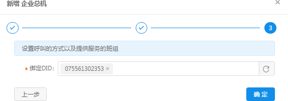④設(shè)置接入該企業(yè)總機(jī)的 DID 大號(hào),如下圖所示,設(shè)置好之后點(diǎn)擊確定按鈕,企業(yè)總機(jī)功能創(chuàng)建成功。