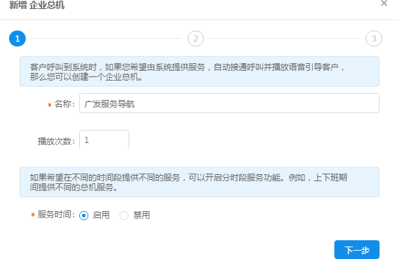 ①配置 ivr 語音的播放次數(shù)以及名稱(請(qǐng)閱讀藍(lán)框內(nèi)容中注意事項(xiàng)),并啟用之,如下圖所示,點(diǎn)擊下一步;