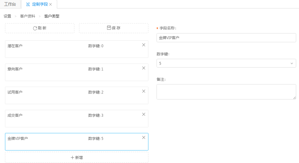 我們還可以新增刪除或者修改客戶類型描述,這里以新增為例,點擊新增按鈕,如下圖所示,我們填寫客戶類型代表的字段名稱,選擇對應(yīng)的數(shù)字鍵作為標(biāo)記,另附備注,點擊保存則新增成功。