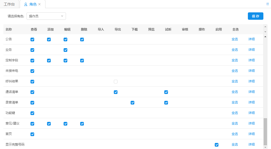 角色,即企業(yè)管理員對系統(tǒng)角色的各種操作權(quán)限的控制。角色包括操作員、經(jīng)理、財務(wù)、班長坐席、普通坐席,而管理員具有最高操作權(quán)限。權(quán)限種類包括查看、添加、編輯、刪除、導(dǎo)入、導(dǎo)出、下載、預(yù)覽、試聽、審核、操作、啟用。