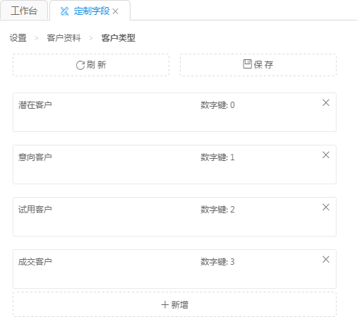 定制字段主要包括自定義客戶信息字段、自定義客戶類型字段。打開設(shè)置菜單下的定制字段菜單項,我們可以看到該模塊所包括的基本內(nèi)容。