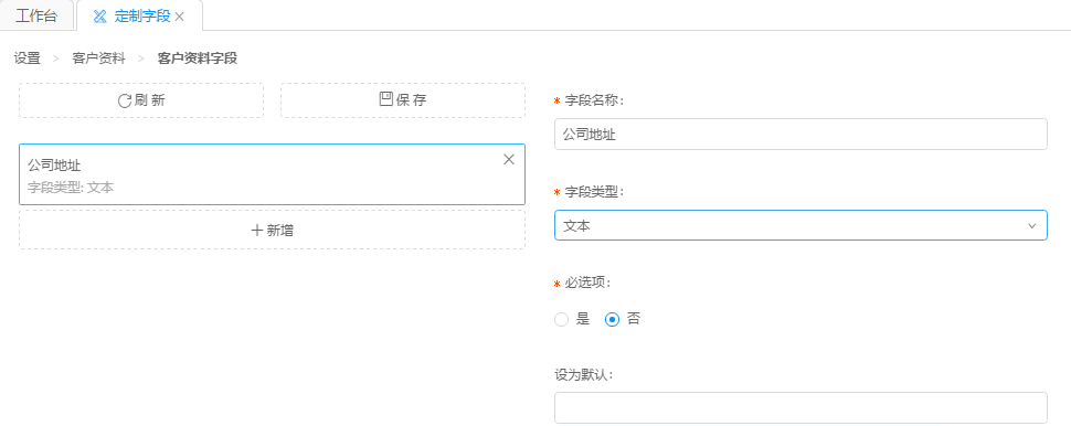 客戶資料字段因業(yè)務(wù)不同所關(guān)注的信息不同,系統(tǒng)默認(rèn)只提供了客戶名稱、性別、客戶號碼信息,我們還可以自定義客戶信息,例如公司地址、最高學(xué)歷等字段。點擊新增按鈕,我們可以看到如下圖所示的配置框,我們新增時需要填寫字段名稱,選擇字段類型,是否設(shè)置為必選項以及默認(rèn)值等等,配置完之后點擊保存按鈕新增成功,下面來一一說明。