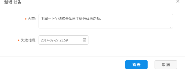 該操作新增一條公告消息,以便讓企業(yè)各角色、坐席員工看到相關(guān)的通知消息。直接點擊新增按鈕,談出如下圖所示數(shù)據(jù)配置框,填寫通知內(nèi)容以及公告的失效日期,點擊確定按鈕即可成功新增公告通知。成功之后可以在工作臺的公告板塊查看相應(yīng)的通知。
