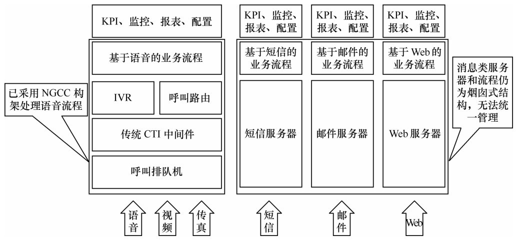 如圖8-2所示,在現(xiàn)有的呼叫中心系統(tǒng)中,盡管已經(jīng)采用了NGCC的軟交換構(gòu)架,但仍然是煙囪式的縱向分層結(jié)構(gòu),如短信業(yè)務(wù)、郵件業(yè)務(wù)和Web業(yè)務(wù)分別由不同的服務(wù)器接收,然后分別建立基于短信的業(yè)務(wù)流程、基于郵件的業(yè)務(wù)流程和基于Web的業(yè)務(wù)流程,再對短信、郵件、Web的業(yè)務(wù)內(nèi)容分別進(jìn)行監(jiān)控、路由,分別給出報表、數(shù)據(jù)配置、對外接口等。這種煙囪式的縱向分層結(jié)構(gòu),缺點是非常明顯的。首先,無法為各種業(yè)務(wù)進(jìn)行統(tǒng)一排隊并選擇合理的坐席為客戶服務(wù)。例如,該系統(tǒng)無法對基于語音的客戶和基于短信的客戶進(jìn)行統(tǒng)一排隊,以致于坐席無法同時服務(wù)于語音呼叫的客戶和基于短信的客戶。其次,對每個業(yè)務(wù)建立不同的流程(如基于語音的業(yè)務(wù)流程、基于短信的業(yè)務(wù)流程、基于郵件的業(yè)務(wù)流程、基于Web的業(yè)務(wù)流程),又對每個系統(tǒng)(如語音客服系統(tǒng)、郵件客服系統(tǒng)、短信客服系統(tǒng)、Web客服系統(tǒng))分別進(jìn)行監(jiān)控、配置等操作,這增加了系統(tǒng)的繁瑣程度,降低了系統(tǒng)效率。再次,煙囪式的縱向分層結(jié)構(gòu)中,不同的客服系統(tǒng)對外給出不同的接口(如語音/視頻客服系統(tǒng)接口、郵件客服系統(tǒng)接口、短信客服系統(tǒng)接口、Web客服系統(tǒng)接口),這不利于第三方應(yīng)用的開發(fā),也不符合統(tǒng)一通信的原理和趨勢。
