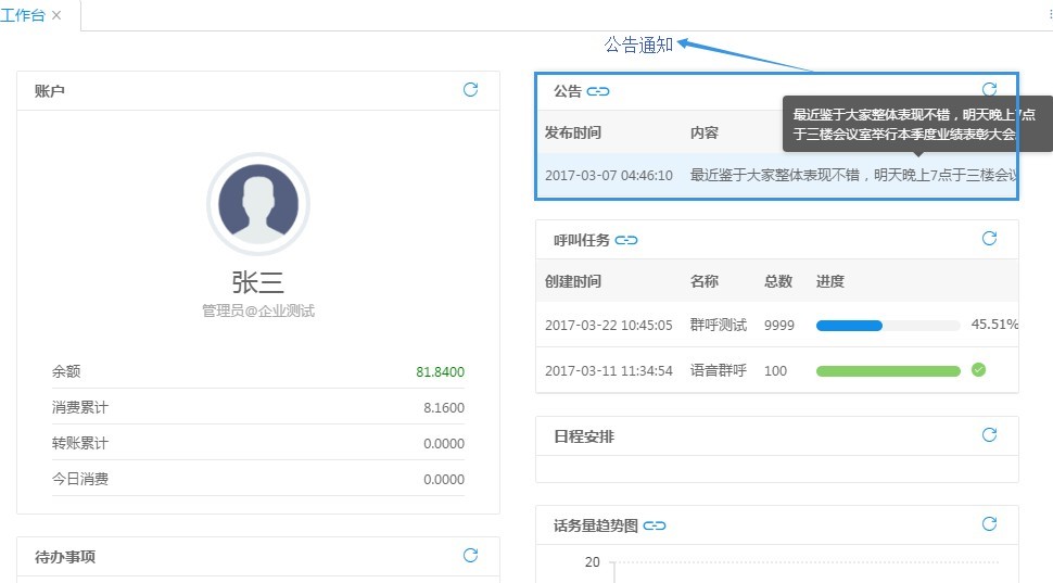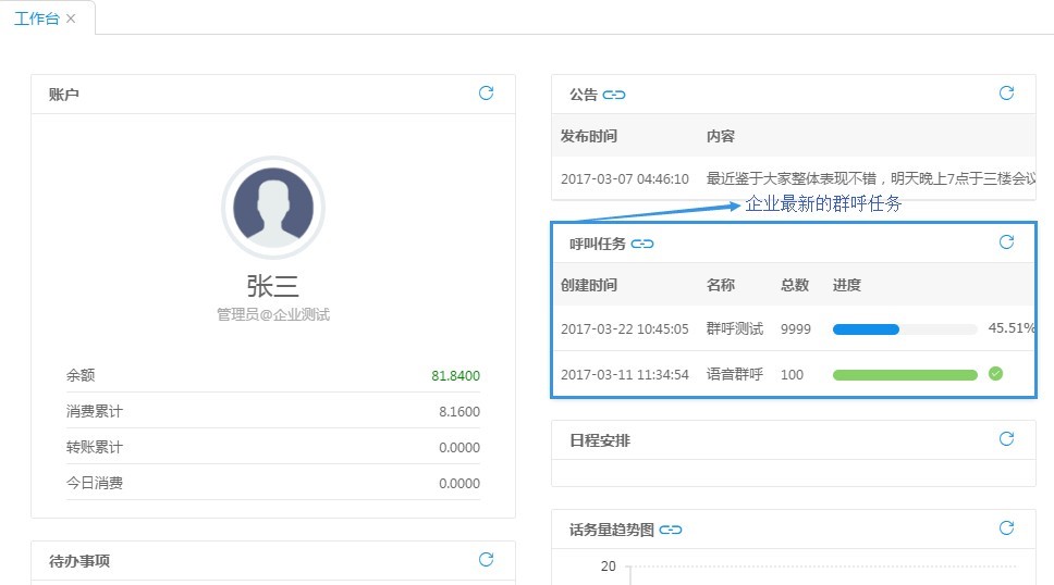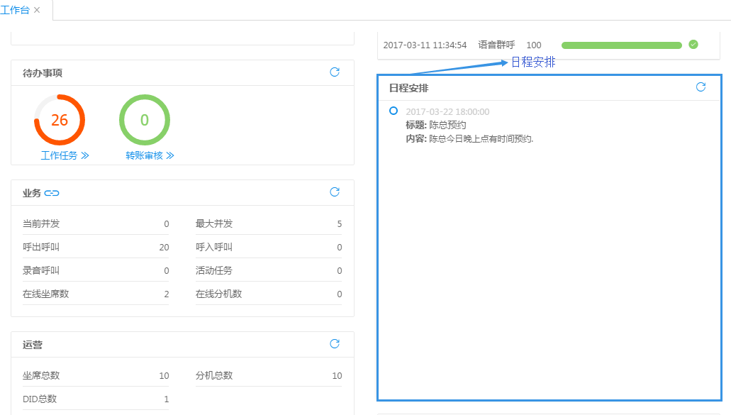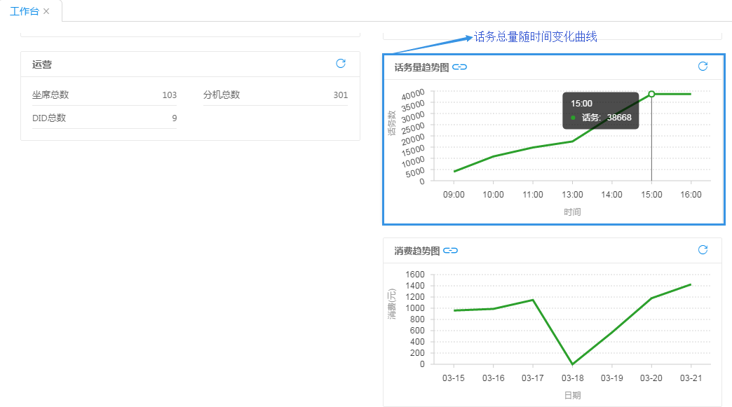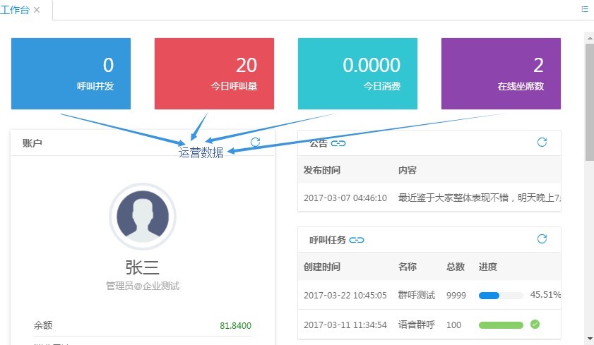 呼叫并發(fā):當(dāng)前該客戶的所有呼叫路數(shù),包括正在呼叫的與正在等待接通的; 今日呼叫量:從今日凌晨 00:00:00 到當(dāng)前產(chǎn)生的話單條數(shù);今日消費(fèi):包括今日凌晨 00:00:00 開(kāi)始業(yè)務(wù)產(chǎn)生的話單費(fèi)用總和; 在線坐席數(shù):當(dāng)前可以進(jìn)行呼叫業(yè)務(wù)的坐席數(shù)量。