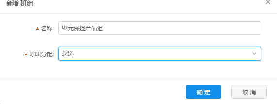 該操作新建一個班組。點擊新增按鈕彈出如下圖所示數(shù)據(jù)配置框,填寫班組名稱以及呼叫分配策略,點擊確定按鈕,班組添加成功。