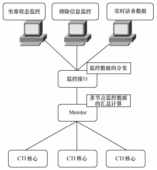 CTI監(jiān)控功能通過Monitor監(jiān)控模塊實現,Monitor模塊與所有的CTI模塊建立連接,從CTI獲取實時的呼叫事件,并以此進行話務的計算匯總和狀態(tài)監(jiān)控匯總[5]。Monitor可以將計算匯總得到的數據和狀態(tài)數據,根據設置的權限分發(fā)給不同的監(jiān)控終端,如坐席狀態(tài)、實時話務、排隊信息等,并可以顯示在大屏上,如圖所示: