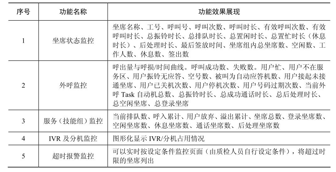 CTI監(jiān)控功能包括對坐席工作情況的監(jiān)控、坐席和系統(tǒng)話務的實時計算、坐席狀態(tài)的監(jiān)控、IVR話路的監(jiān)控、坐席分機的監(jiān)控、服務的排隊監(jiān)控、坐席電話的強行控制等,主要在班長席和質檢席體現,也可以通過自定義的方式配置監(jiān)控功能給其他的坐席人員。