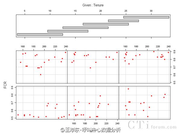 下圖是一組FCR與AHT之間的關(guān)系受員工在職時(shí)長(zhǎng)影響的探索示例,影響可能明顯,也可能并不明顯。