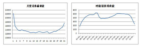 月度話務(wù)規(guī)律呈現(xiàn)U型,月初和月末話務(wù)需求偏高,月中話務(wù)需求偏低,主要受公司業(yè)務(wù)影響,月初為扣費(fèi)、出賬、開(kāi)通集中日期,而月末則是扣費(fèi)、停機(jī)、咨詢以及取消集中日期?!r(shí)段話務(wù)規(guī)律呈現(xiàn)M型,午間和晚間時(shí)段為話務(wù)需求高峰,早間和下午時(shí)段則為全天話務(wù)的低谷,與客戶作息時(shí)間和使用終端產(chǎn)品有直接關(guān)系。