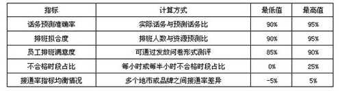 結(jié)合排班過(guò)程以及運(yùn)營(yíng)指標(biāo)的要求,排班成效評(píng)估因子應(yīng)該包括預(yù)測(cè)準(zhǔn)確率、排班吻合度、員工滿意度以及指標(biāo)均衡度;以筆者所在呼叫中心為例,排班成效應(yīng)該涉及以下5項(xiàng)因子(如表2):