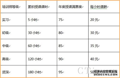 虛擬團(tuán)隊(duì)培訓(xùn)師參與實(shí)戰(zhàn)后,可以根據(jù)累積授課課時(shí)、年度授課滿意度來給培訓(xùn)師評(píng)等級(jí),并給不同等級(jí)的培訓(xùn)師設(shè)置不同的授課時(shí)薪,參考標(biāo)準(zhǔn)如下: