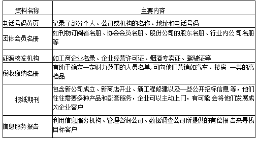 指通過(guò)查詢(xún)與目標(biāo)客戶(hù)相關(guān)的資料來(lái)尋找目標(biāo)客戶(hù),可供查詢(xún)的資料如表3-2所示。
