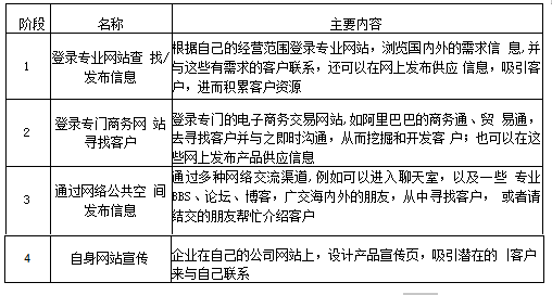 網(wǎng)絡(luò)尋找法指借助互聯(lián)網(wǎng)宣傳、介紹自己的產(chǎn)品從而尋找客戶(hù)的方法。隨著上網(wǎng)人數(shù)的日漸增多,企業(yè)很容易在網(wǎng)絡(luò)上找到客戶(hù),因此該方法前景廣闊,其實(shí)施方式如表3-6所示。