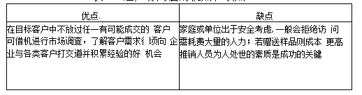 4)探查訪(fǎng)問(wèn)。對(duì)于一個(gè)缺乏經(jīng)驗(yàn)的推銷(xiāo)人員而言,直接上門(mén)探查訪(fǎng)問(wèn)是尋找潛在客戶(hù)的途徑。上門(mén)探查訪(fǎng)問(wèn)需要推銷(xiāo)人員花費(fèi)很多時(shí)間、精力和費(fèi)用,但是在這個(gè)過(guò)程中他們不但獲得了尋找客戶(hù)的經(jīng)驗(yàn),學(xué)會(huì)了與客戶(hù)溝通的方法,也鍛煉了工作勇氣和意志。