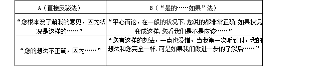 人有一個通性,不管有理沒理,當自己的意見被別人直接反駁時,內(nèi)心總會感到不快,尤其是當他遭到一位素昧平生的推銷人員的正面反駁時。屢次正面反駁客戶會讓客戶惱羞成怒,就算你說得都對,而且也沒有惡意,也會引起客戶的反感,因此,推銷人員最好不要開門見山地直接提出疚對的意見。在表達不同意見時,盡量利用是的……如果的句法,軟化不同意見。請比較表4-4中A、B的兩種說法,感覺是否有天壤之別。