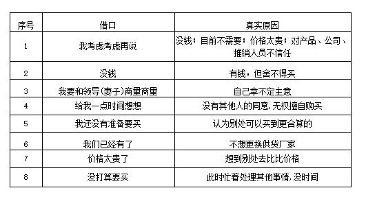 (2)假異議。假異議通常可以分為兩種,一種是指客戶用借口、敷衍的方式應付推銷人員,目的是不想誠意地和推銷人員會談;另一種是客戶提出很多異議,但這些異議并不是他們真正在意的地方,如這件衣服 是去年流行的款式,已過時了這車子的外觀不夠流線型……雖然聽起來也是異議,但不是客戶真正的異議。對于這類異議,推銷人員應當首先了解顧客借口后面的真實動機,幫助顧客共同努力消除真正的 障礙。表4-2列出了顧客借口背后的真實原因,但要注意給顧客一個從借口上下來的臺階。