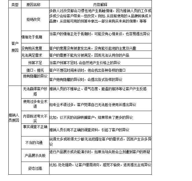 (3)產(chǎn)品異議。也叫質(zhì)量異議,對產(chǎn)品質(zhì)量提出質(zhì)疑,是異議中較難攻克的一種。