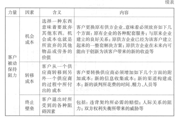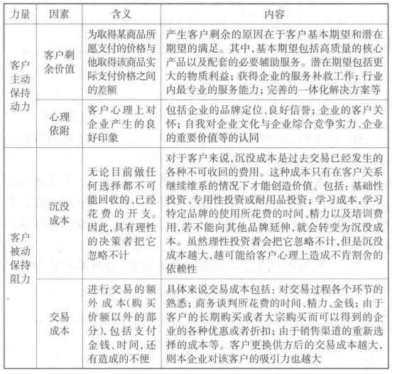 如表5-7所示,列出了影響客戶保持效果的力量、因素以及主要內容。