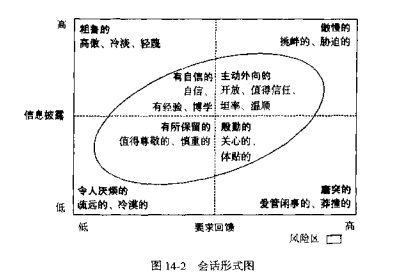 同樣的,企業(yè)必須實施適當(dāng)?shù)臅捫问?,與客戶達到和諧境界,這是與傳統(tǒng)想法迥異的理論。有人堅稱企業(yè)應(yīng)該對客戶盡可能殷勤周到,多問問題,伸出雙手主動協(xié)助。客戶希望通過非推銷性質(zhì)的電話,感覺到與公司有所聯(lián)系。若應(yīng)用人際溝通研究模型,我們可以看到從兩大因素中衍生的一套會話形式(圖14-1E一家公司從某一客戶身上取得的信息多寡,表示該公司認為自己和這位客戶的關(guān)系狀況。相同的,一家公司主動提供的信息多寡,代表他希望與這位客戶建立何種程度的熟悉度。