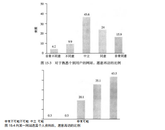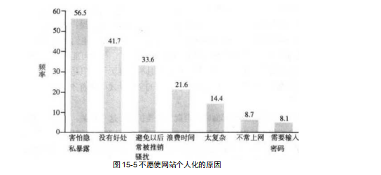 然而,有些網(wǎng)絡(luò)使用者不愿意提供信息給網(wǎng)站,因?yàn)樗麄兒ε率ル[私,也怕該 網(wǎng)站或其他公司以后一再騷擾(圖15?5)。要減輕這種恐懼感,個(gè)人化或定制的網(wǎng)站 必須花費(fèi)時(shí)間精力讓用戶安心,確保他們的信息安全無(wú)虞,而且也不會(huì)因此受到推銷的騷擾。