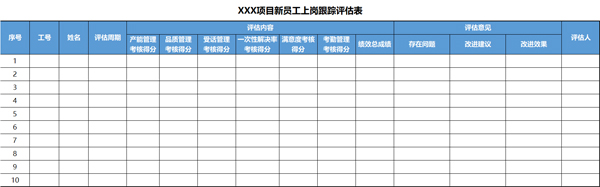?、?新員工入組上崗后須至少進行一個月的跟蹤評估,由各組TL對新員工每天的績效原始數(shù)據(jù)、考核得分及綜合表現(xiàn)情況進行記錄,并將結(jié)果定期整理反饋給培訓(xùn)負責(zé)人,參考用表《XXX項目新員工上崗跟蹤評估表》見下。